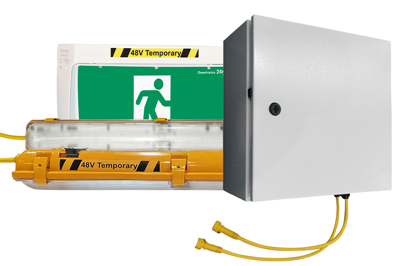 The 48V system includes a full range of temporary lighting products designed for construction sites, including weatherproof battens, exit lights, flood lights, power supplies, and a coordinated cabling and connector system.