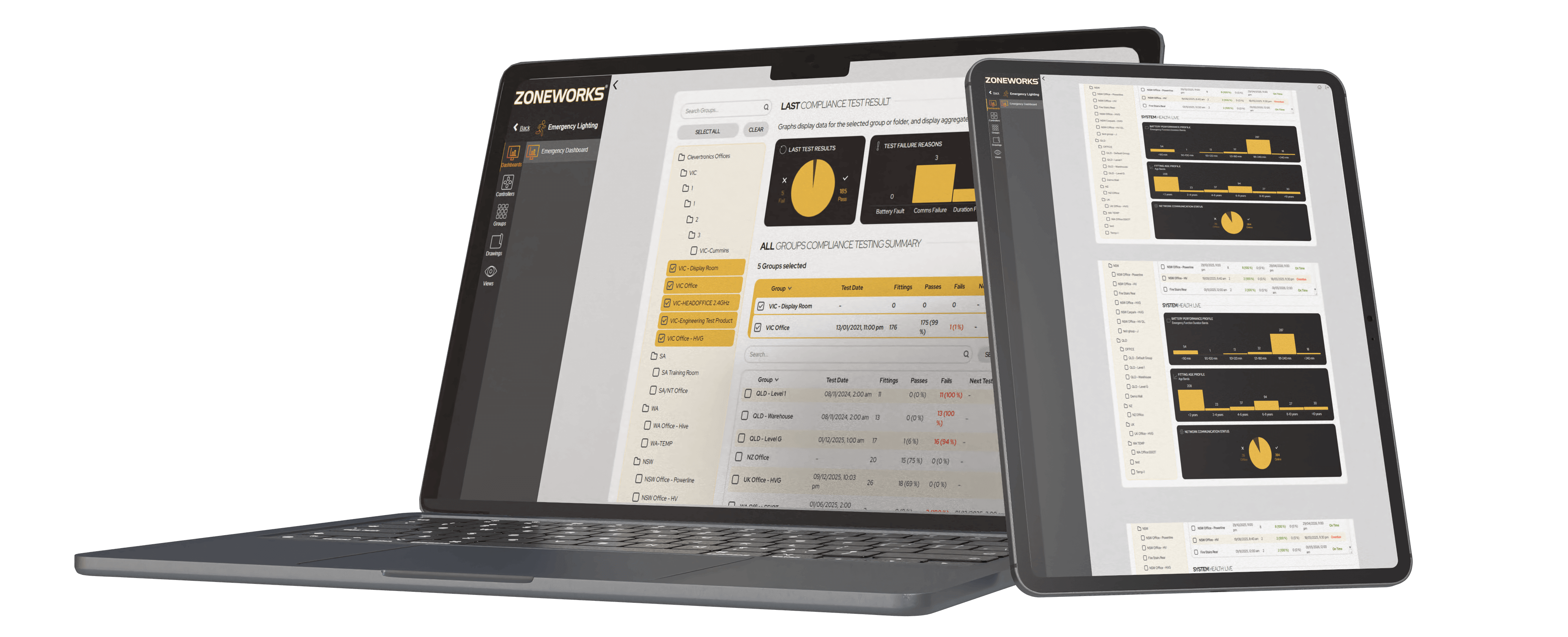 The Zoneworks HIVE System Health Dashboard provides a comprehensive, real-time view of your emergency lighting system, including battery performance and fitting age profiles. With clear pass or fail indicators and failure reasons, users can quickly identify issues, track trends and proactively plan maintenance and future investments, ensuring compliance and system reliability at a glance.